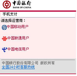 開通手機銀行(理財版或貴賓版)后,請通過手機登錄中國銀行手機銀行地址“mbs.boc.cn”(圖1),進入選擇運營商頁面。