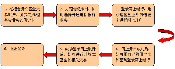 1.為了向我們的客戶提供豐富多樣和更為便捷的基金理財服務,中國銀行推出了網上基金交易系統。您可以通過這一新的交易渠道,足不出戶地進行基金交易業務,享受中國銀行提供的優質服務。目前該系統可以為您提供以下各項服務:基金認購、基金申購、基金贖回、設置/取消自動再投資、基金代碼查詢、基金單位凈值查詢、基金賬戶余額查詢、基金交易明細查詢、基金資金賬戶余額查詢等。辦理流程如下圖所示: