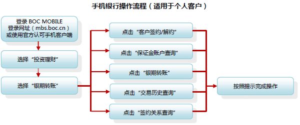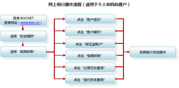 第二步:請您按照我行網銀BOCNET個人服務申請受理流程申請我行BOCNET理財版?zhèn)€人服務,開通網銀服務后,您可登錄我行網銀系統(tǒng)自助開通投資服務,選擇銀期轉賬——簽約,并在線確認簽署《中國銀行銀期轉賬服務協(xié)議書》(個人投資者網銀適用),開通銀期轉賬服務。